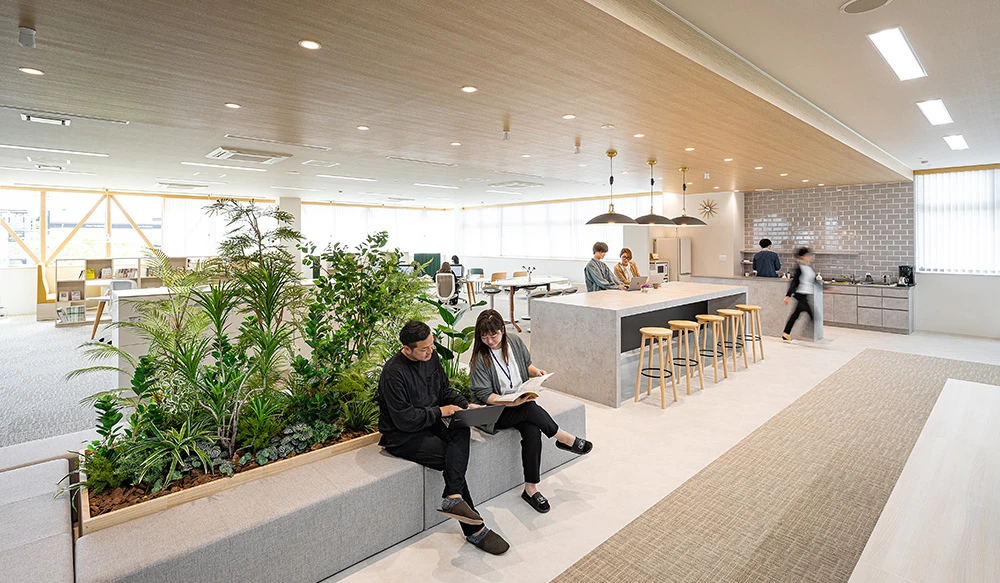 オフィス新築のデザインや働き方の側面から、お声をかけていただきました。まずは、コミュニケーションを活発化させるフリーアドレスとキッチンスペースをご提案しました。また性別関係なく心理的安全性や快適性を感じられるカジュアルなオフィス空間の提案を行いました。