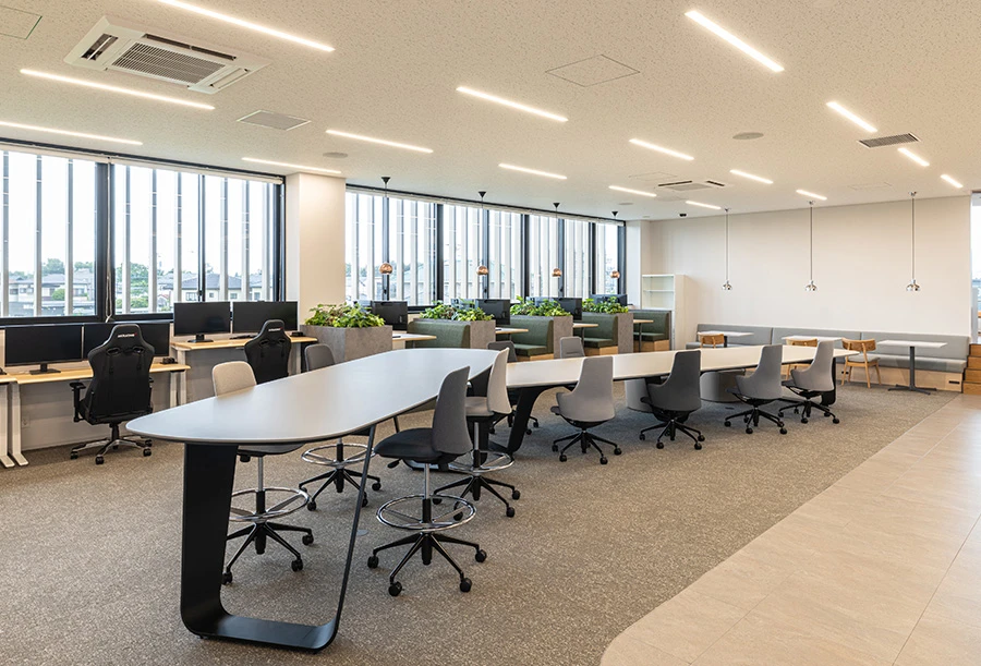 相談しやすくなる席配置、誰もが気持ちよく使える共用スペース、チームの一体感が生まれる空気感、Dexiはそのすべてをデザインします。