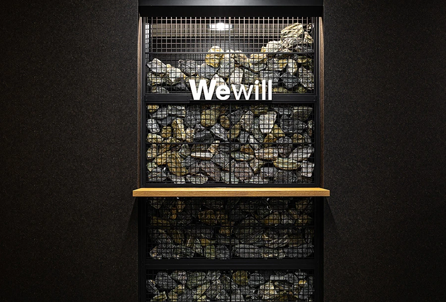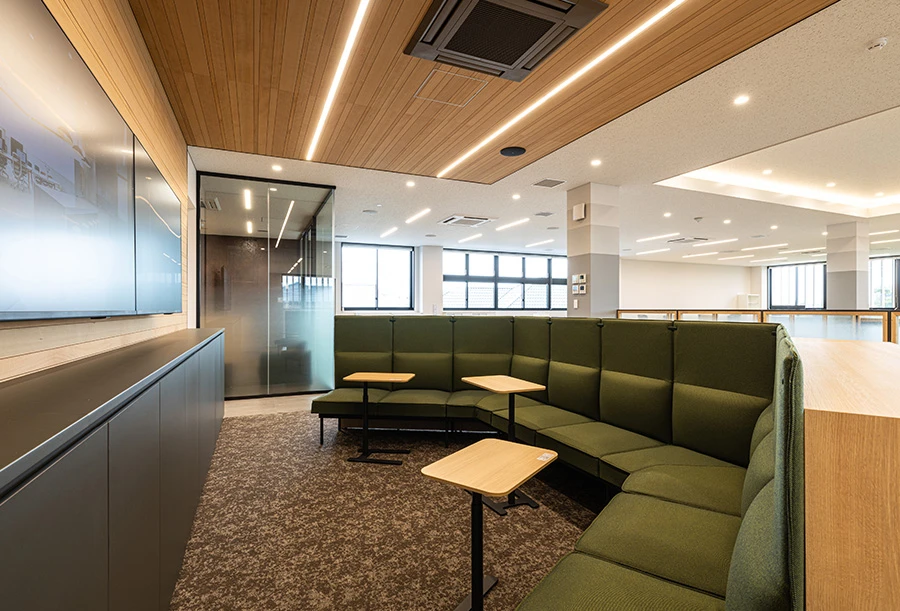 オフィス空間をガラッと変えるために、内装材の選定にこだわったり、増えるWeb会議に対応するために、Webルームの設置をご提案。また、コミュニケーションを活発化させるために、サイネージで社内の情報共有をご提案しました。
